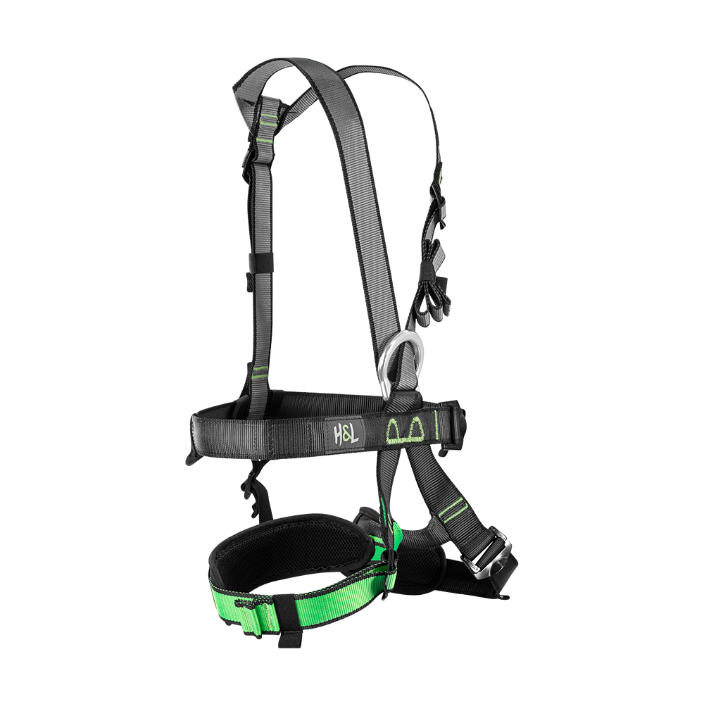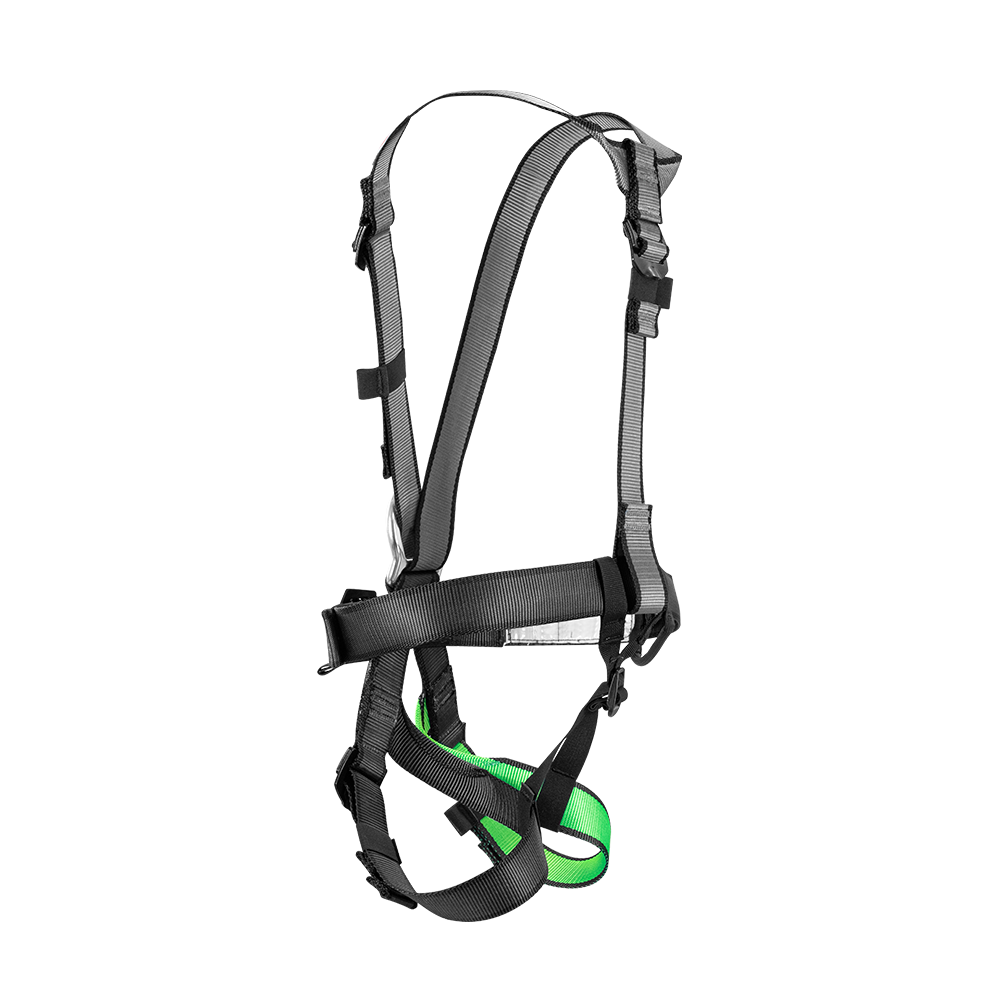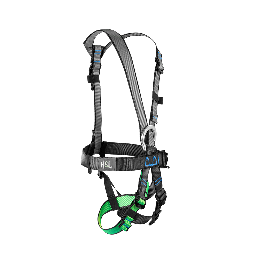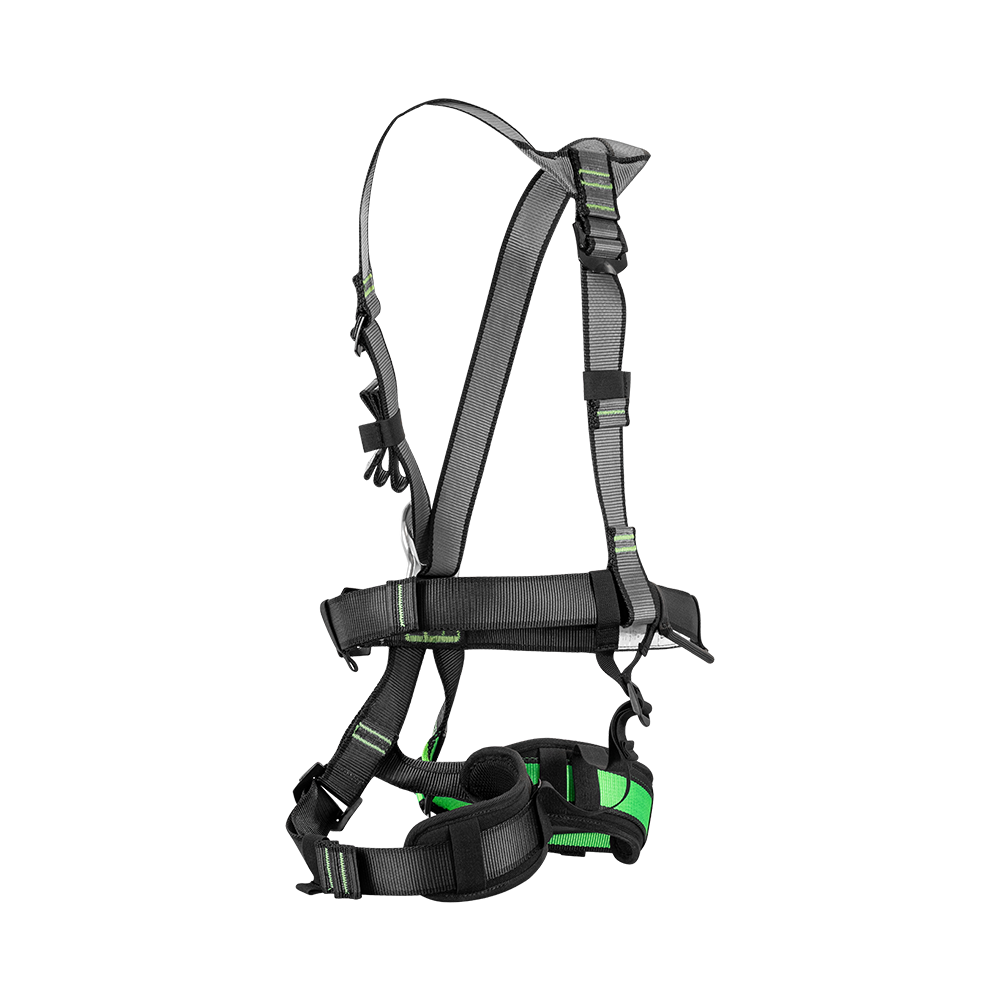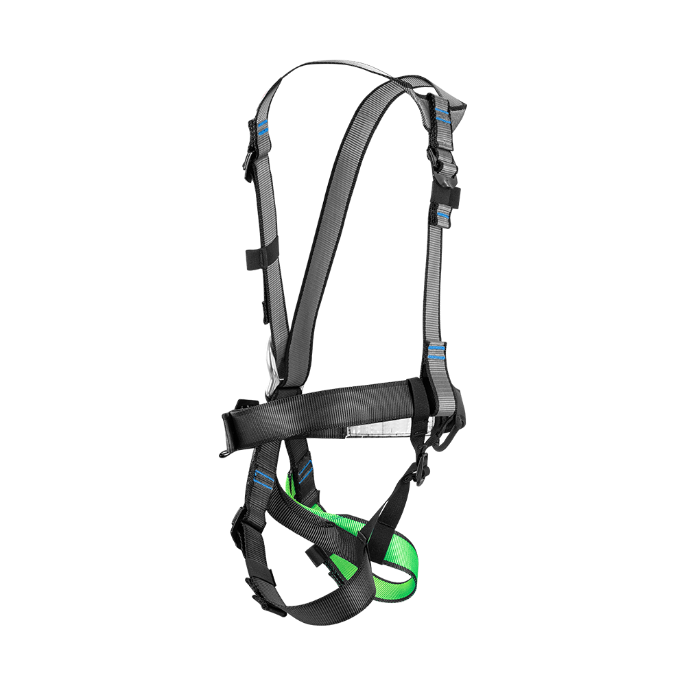 The harness has color-coded sizes. Blue seam XS Size 0. Green seam S-L size 1, Gray seam XXL size 2. Right leg strap is in green color for easier putting on. Equipment loop on higher side which is exchangeable/removable, Selen has a slot for mounting ex CARITRAC for trolleys. Leg padding on the larger sizes is replaceable/removable.